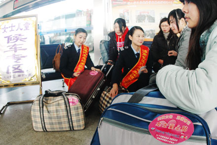 “中華第一站”濟(jì)南長(zhǎng)途汽車總站成立了“春日閃亮服務(wù)組”,全部由女服務(wù)員組成,為廣大女性旅客特別是其中的老弱病殘?jiān)杏椎戎攸c(diǎn)旅客提供專屬看護(hù)、提前購票、優(yōu)先乘車等細(xì)致、貼心的服務(wù);總站南區(qū)推出“女士?jī)和诰€選座購票”、“女士?jī)和瘜>€車”,