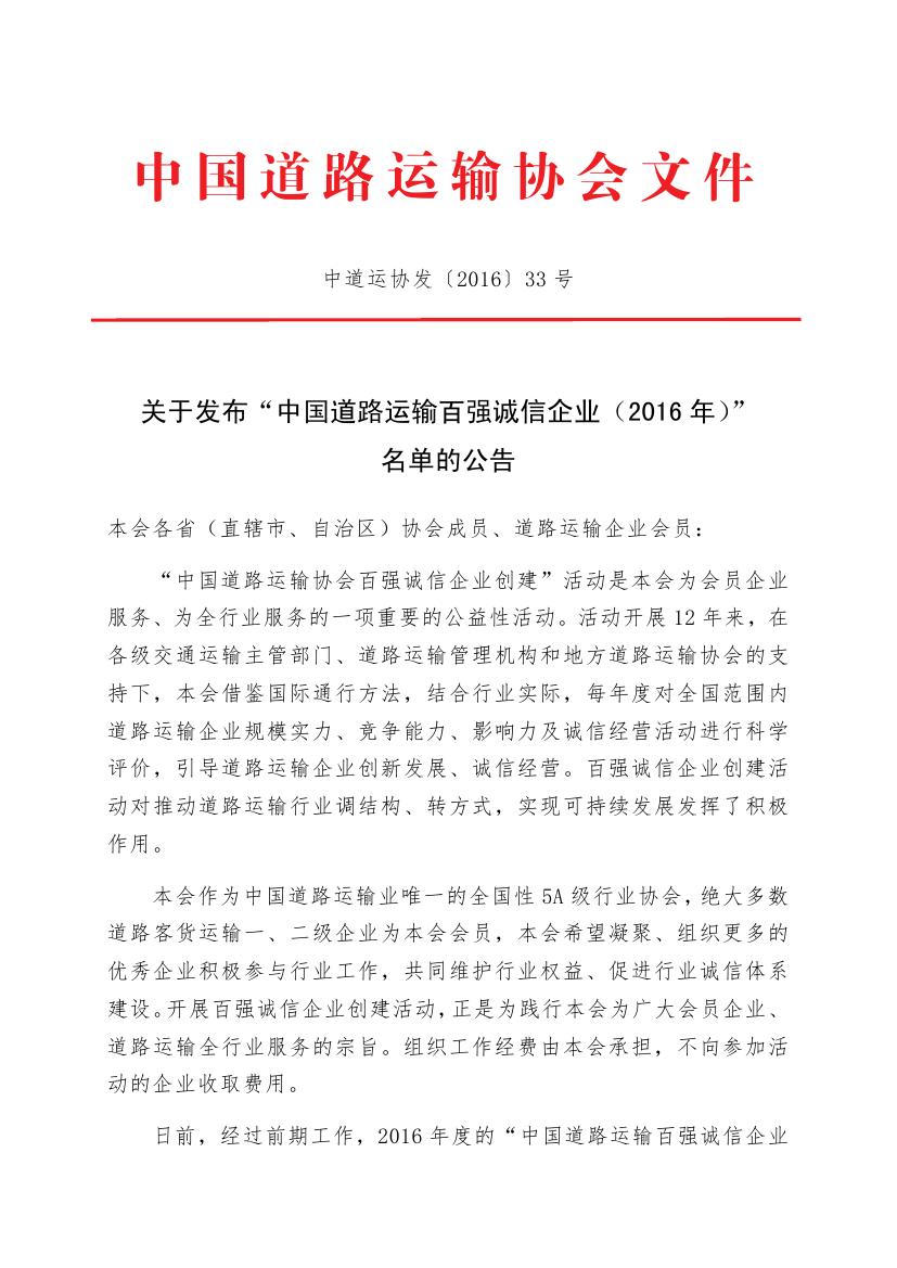 6月24日,中國道路運輸協(xié)會發(fā)布了2016年度道路運輸百強(qiáng)誠信企業(yè)名單,集團(tuán)再度榮獲“全國道路運輸百強(qiáng)誠信企業(yè)”稱號,排名第十一位,比去年前進(jìn)一個名次。