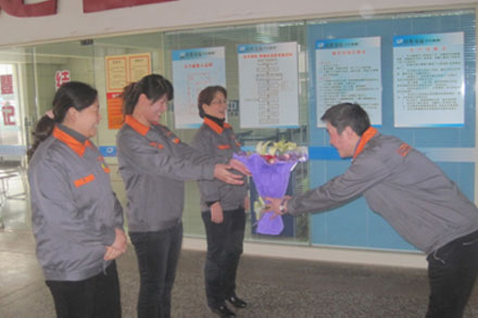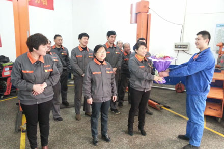 3 7日,汽車修理廠女同胞們收到了一份意外驚喜,汽修廠各廠區的男同胞偷偷預備了鮮花,在早上晨會為女同胞們獻上了關愛與祝福,女同胞們被這突如其來的祝福所感動,幸福的笑容洋溢在她們臉上。